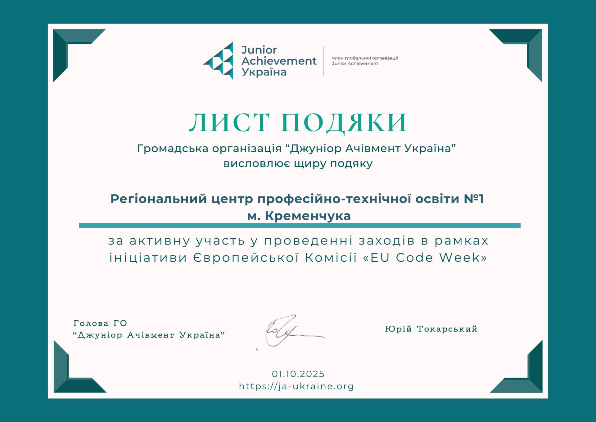 Здобувачі освіти РЦ ПТО №1 м. Кременчука разом з викладачем Безклинською К.С. взяли участь у Європейському тижні кодування (EU Code Week) — міжнародній ініціативі, що популяризує програмування та цифрову грамотність.