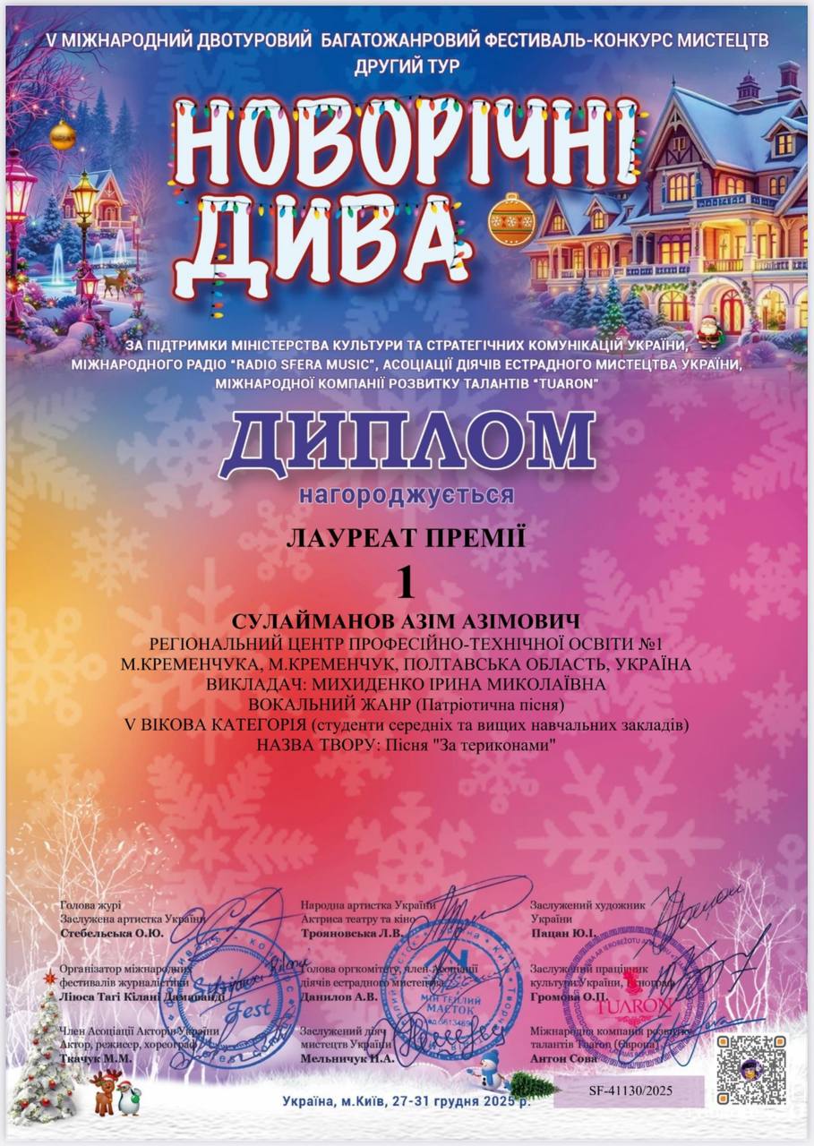 Студенти Регіонального центру професійно-технічної освіти № 1 м. Кременчука стали переможцями V Міжнародного двотурового багатожанрового фестивалю-конкурсу мистецтв «Новорічні дива», який проходив в онлайн-форматі 27–31 грудня 2025 року в м. Києві. У номінації «Вокальний жанр (патріотична пісня)»: – Лауреат І премії — Сулайманов Азім; – Лауреат ІІ премії — тріо «Гармонія» Колтунова Дар’я, Терлецька Маргарита, Просол Анастасія. Щиро вітаємо переможців з високими результатами й гідним представленням закладу на міжнародному мистецькому рівні. Бажаємо подальших творчих звершень, натхнення та нових перемог. Нехай кожен виступ приносить професійне зростання й впевненість у власних силах.