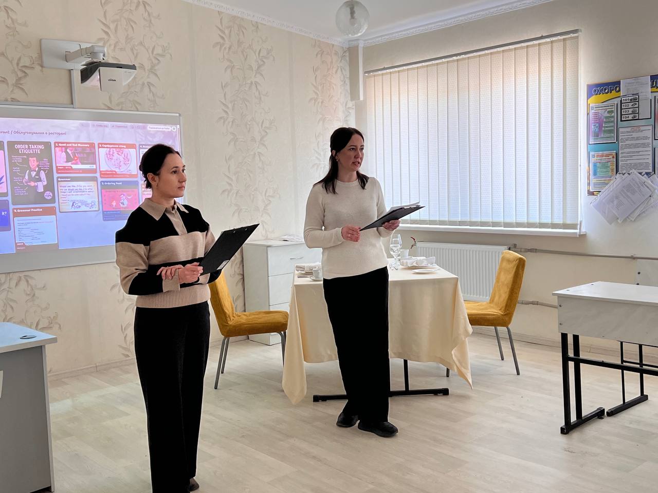 10 березня викладачі Вісич Віта і Шишова Ніна провели відкритий бінарний урок «Service in Restaurant/ Обслуговування в ресторані» у групі МА-24-3. Під час уроку здобувачі освіти поєднали професійні знання з практикою англійської мови. Студенти відпрацьовували лексику ресторанного сервісу, моделювали реальні ситуації обслуговування гостей, практикували діалоги між офіціантом і відвідувачем та вдосконалювали навички професійної комунікації англійською мовою. Такий формат уроку допоміг студентам краще зрозуміти особливості професійного спілкування у сфері ресторанного обслуговування та усвідомити важливість володіння англійською мовою для майбутньої професії.Заняття було динамічним, цікавим, практично спрямованим і сприяло розвитку професійних компетентностей майбутніх фахівців ресторанної справи.